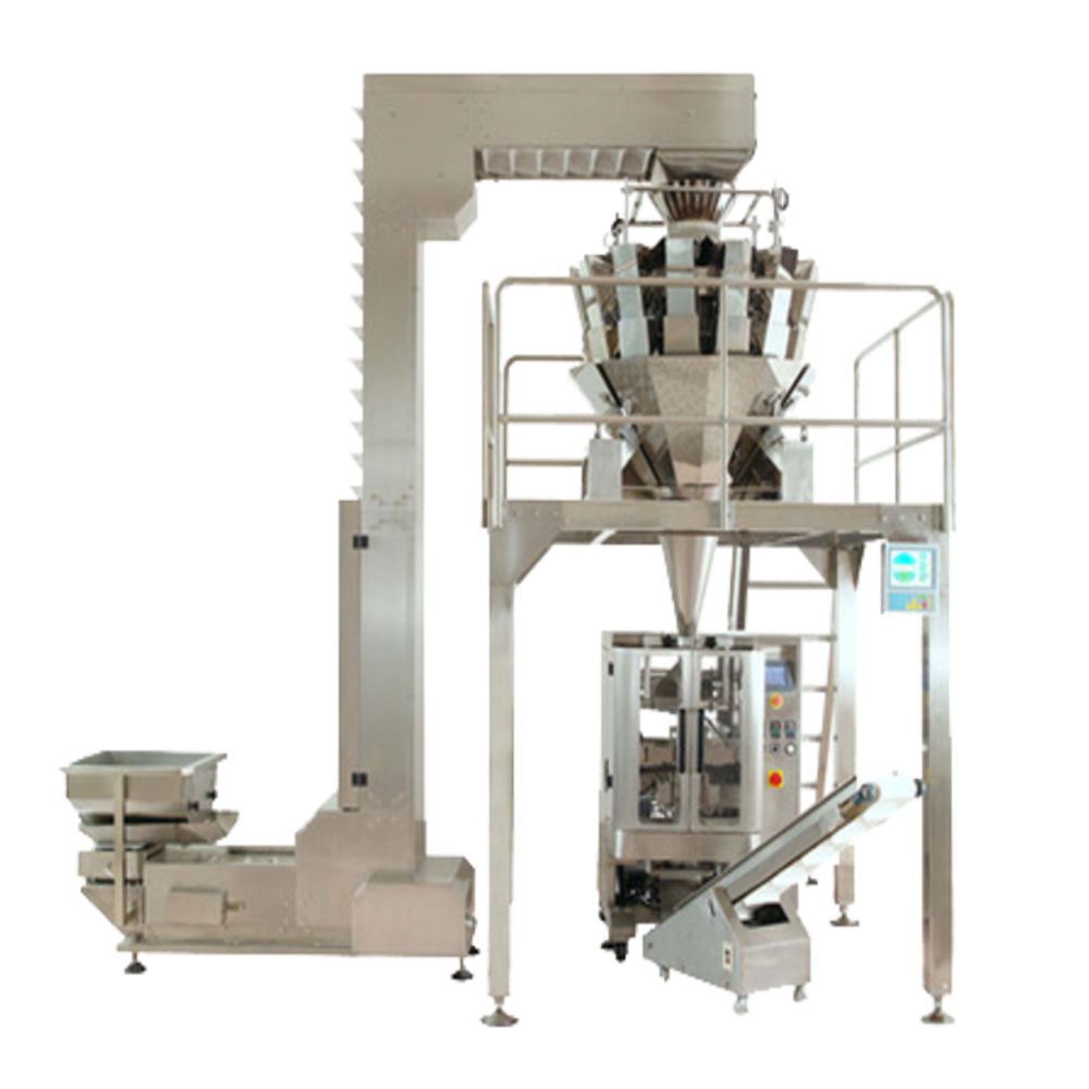 fully automatic multi-head weighing and packaging machine. The machine can be used for packing dry fruits, seeds, spices, vegetables, and other products in powdered form. Also employed as dry fruit packing machine, it can wrap the product in 10 grams to 1 kilogram of pouches and sachets. It seals the product centrally with maximum film roll width of 700 millimeters. It is manufactured on the clutch-brake film draw mechanism aligned with quick AC speed control unit.