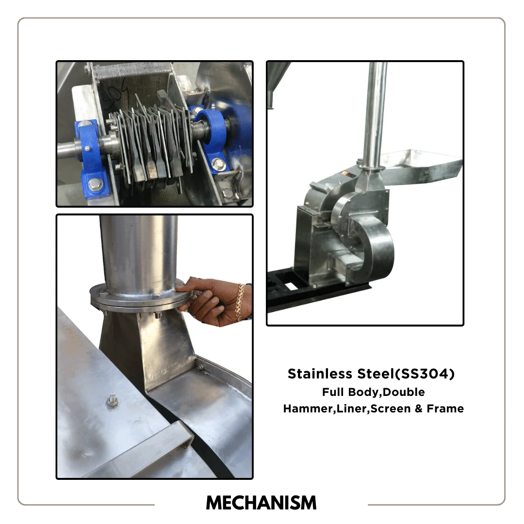 Built in either MS or SS304 Stainless Steel, the machine is durable and compliant with food safety standards. It’s suitable for grinding a wide range of spices and herbs, reflecting Mill Power Pvt Ltd’s 10 years of experience in manufacturing.